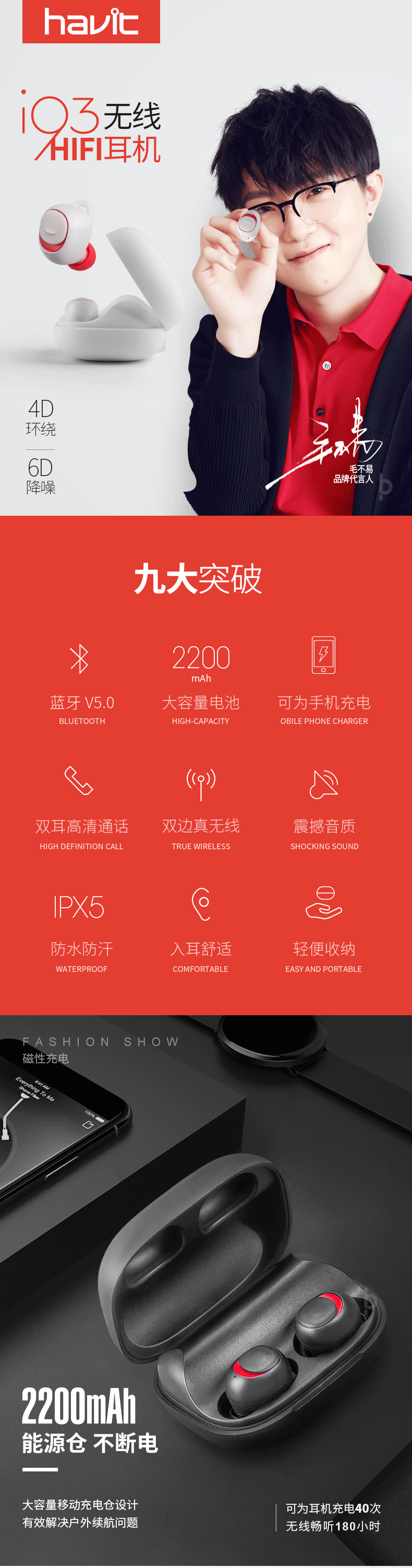Havit藍牙耳機品牌,是由藍牙耳機詳情頁設計,天貓詳情設計,電商詳情設計,寶貝描述設計,電商詳情策劃,電商文案傾情打造,毛不易帶言的時尚藍牙耳機,根據產品賣點,品牌定位,主色調,對產品的功能,特點進行深度挖掘,加上特效演示,來展示產品的設計原理和應用,整體調性簡約高端,上線兩天后轉化率由原來的2%直線上升到11%,效果明顯。