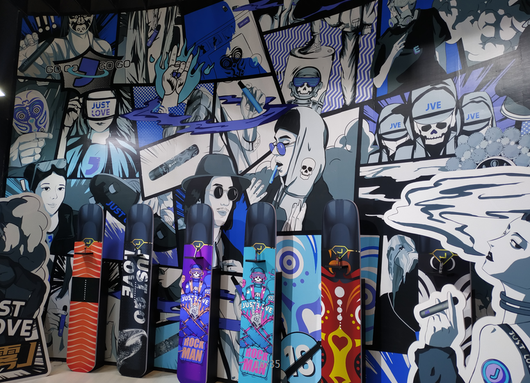 其中最為突出的是同樣以插畫為視覺元素的“非我”電子煙,其展廳裝飾到包裝設(shè)計(jì),元素都已新式的插畫為視覺形象,非我的品牌logo 逗號也是非常醒目,在很多地方都得到巧妙的發(fā)揮,令人過目不忘。